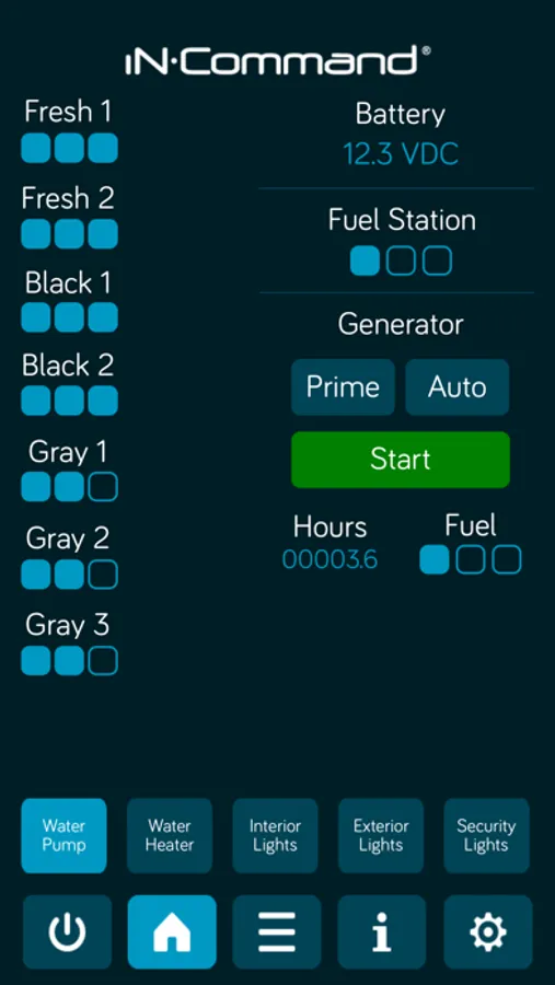 • Lighting control: Interior, exterior, security, awning and custom 1, 2, 3