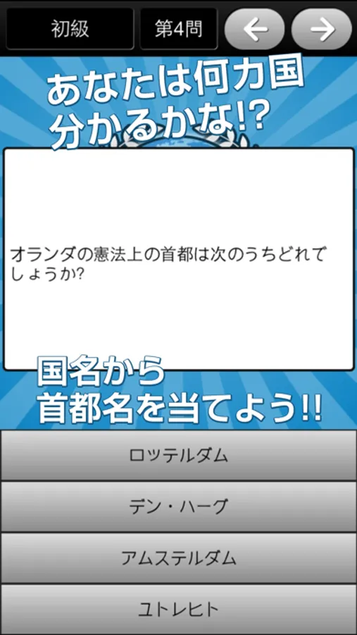 "Capital quiz to Kill time" is a quiz app that you can remember easily the capital (main Metropolitan) of countries around the world. I choose the answer from the four choices. Problem will be questions by difficulty from among the more than 200 !!