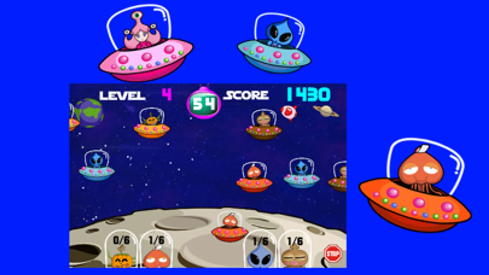 Finish your mission by shooting exactly the number of the different colored enemies indicating below. Be careful, if you shoot more than the indicated number, your score will be reset to zero! Finish each level in time! When time is up, you have to start over from the first level!