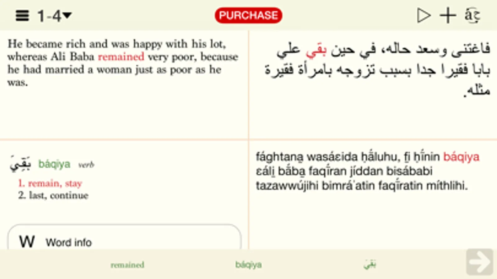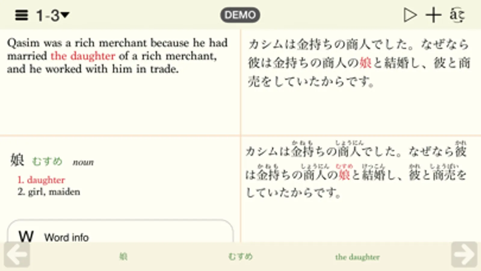 * Tapping a word in one language immediately highlights corresponding word in second language