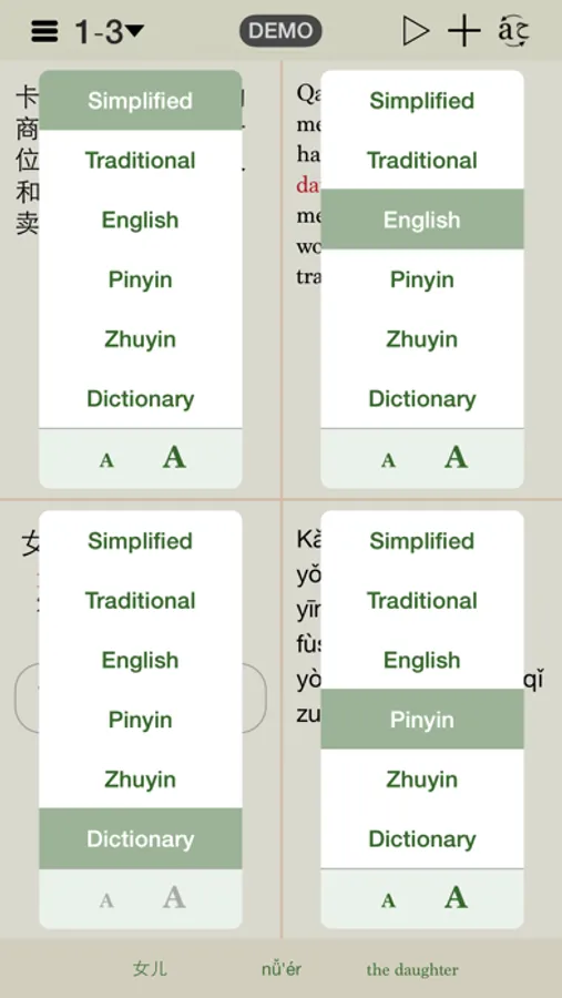 * Segment bar at the bottom of the screen provides a quick reference for translations and pronunciation