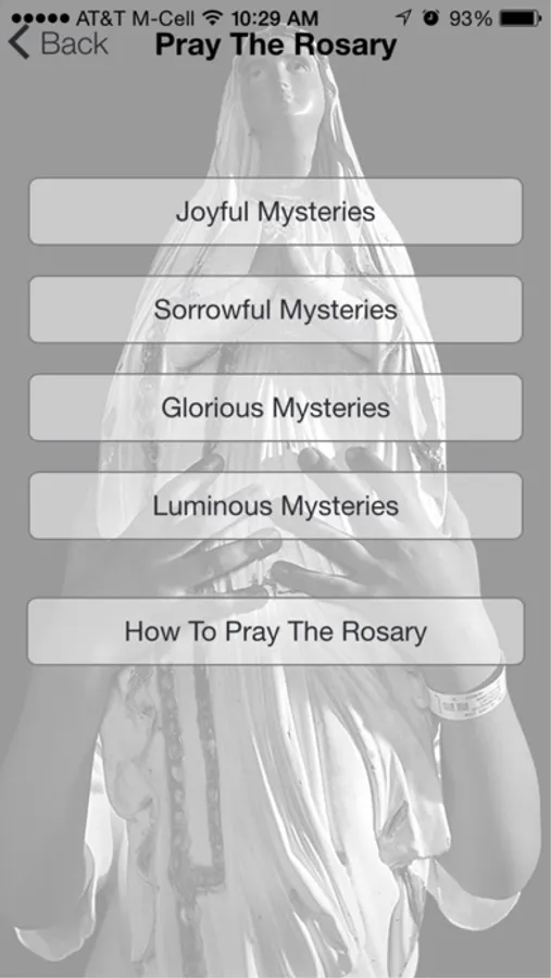 There are twenty mysteries reflected upon in the Rosary, and these are divided into the five JOYFUL MYSTERIES, the five SORROWFUL MYSTERIES, the five GLORIOUS MYSTERIES, and the five LUMINOUS MYSTERIES. The App will automatically offer to play the appropriate mystery based on the day of the week. You also have the opportunity manually to play and pray any of the mysteries.