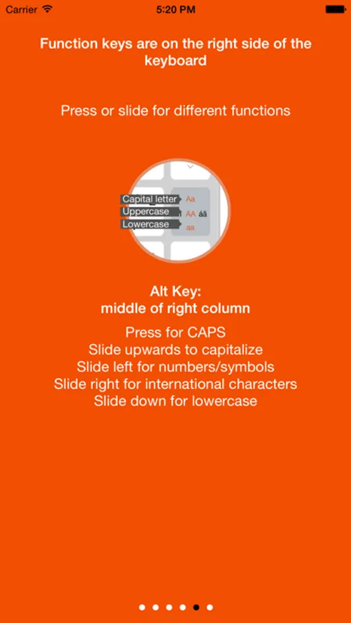 The Alternate Keyboards key is used to write characters that are not in the main keyboard. Slide left (towards "#1") for numbers and additional symbols, upwards ("Aa") for a capitalized initial, right ("áã") for international characters, downwards ("aa") to go back to the small letter keyboard and press ("AA") to turn on CAPS.