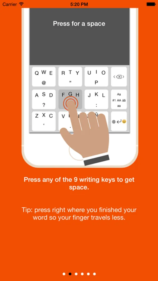 For a space, just press on any of the 9 writing keys, avoiding your finger's trip to the space bar. Tip for faster typing: tap close to where you finish each word.