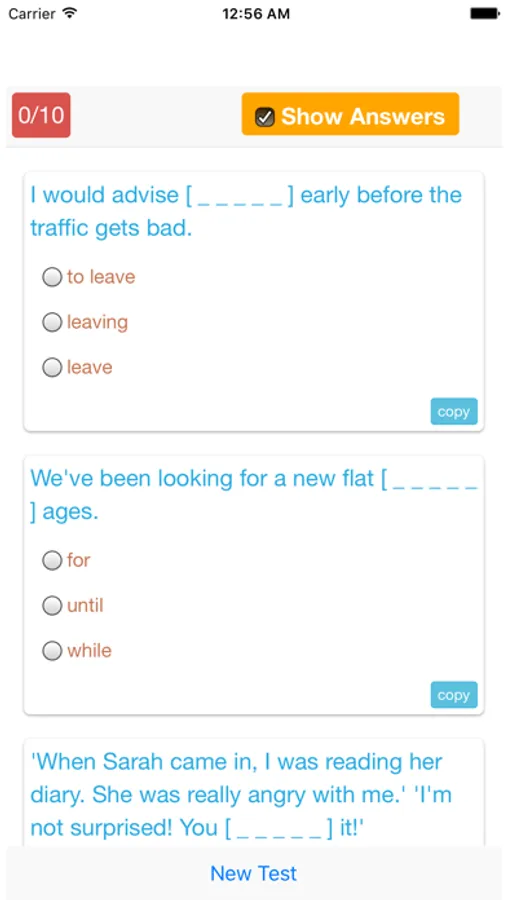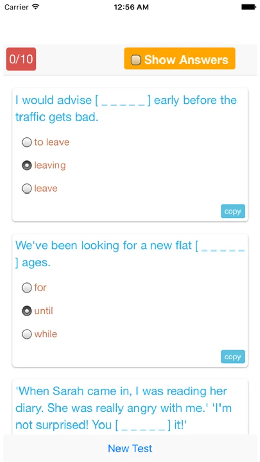 You can take the tests in auto-score mode which marks the correct answer automatically, or test mode which gives you the answers after you've finished all ten questions.