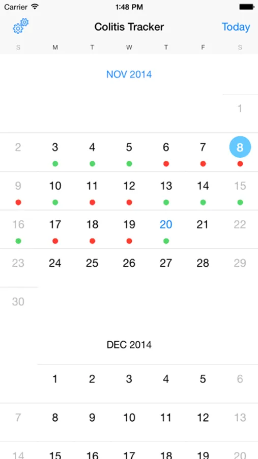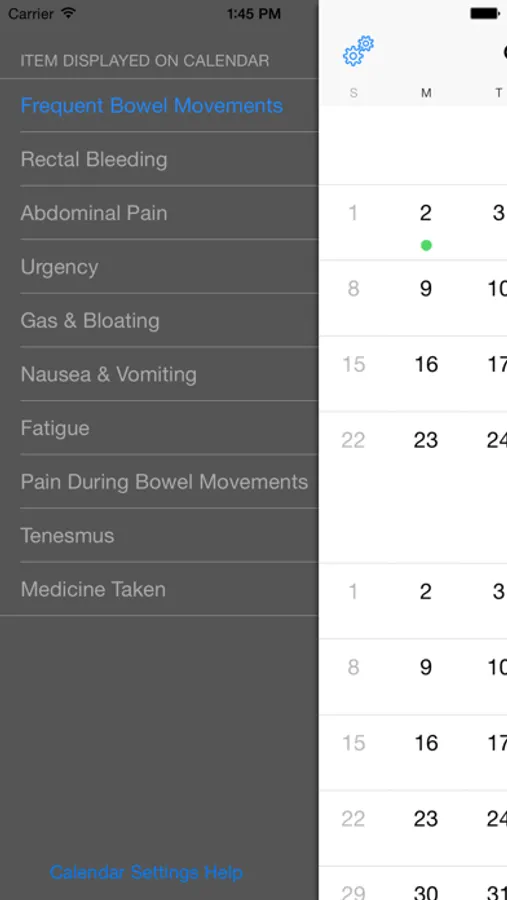 This user friendly app presents you with a straightforward calendar function designed for tracking symptoms of colitis & other related GI concerns. The colitis tracker allows you to record and input information daily and view the frequency of the symptoms are experiencing in a scrolling monthly calendar. To input information, simply select a day. Once you've selected the day, a screen appears that allows you to check off which of the six GI related symptoms you are currently experiencing, input your daily weight, free text in a comment section, and indicate if you've taken any medication. The unique part about viewing the calendar by month is this: under the settings section, you can select one of the six trackable symptoms. Then when you are viewing the calendar, the colitis tracker enables you to view the frequency with which the individual symptom was experienced. Imagine being able to quickly view how many times in a month you've had abdominal pain, frequent bowl movements, or any of the other symptoms you've been experiencing.