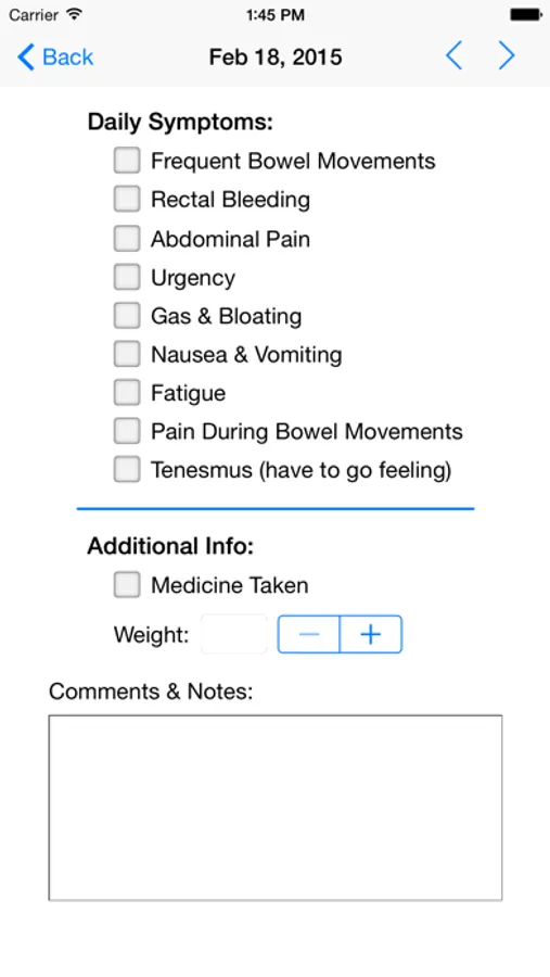 The symptoms you can currently track are: Frequent Bowel Movements, Rectal Bleeding, Abdominal Pain, Urgency, Gas & Bloating, Nausea & Vomiting, Fatigue, Pain During Bowel Movement, and Tenesmus (have to go feeling).