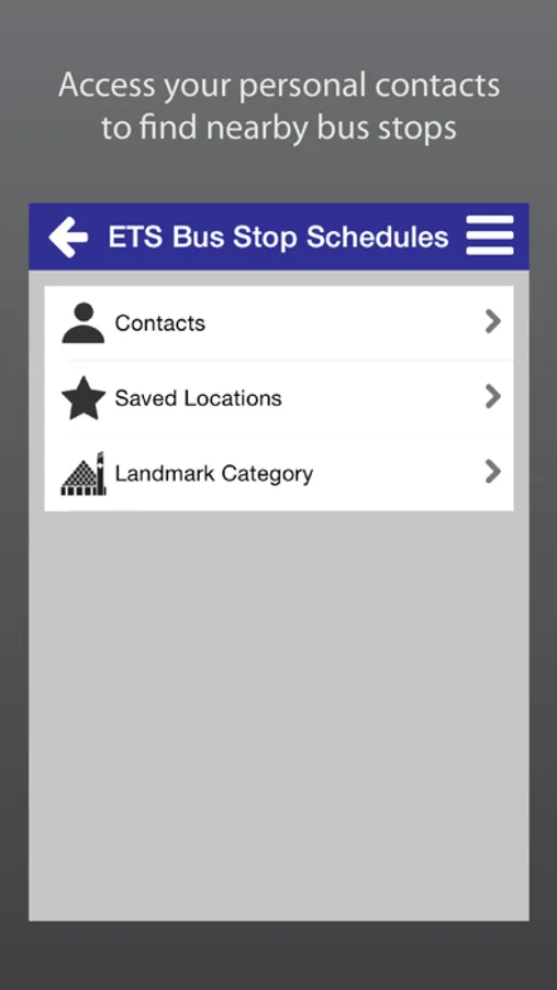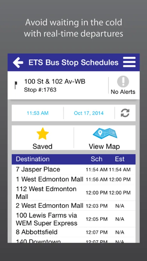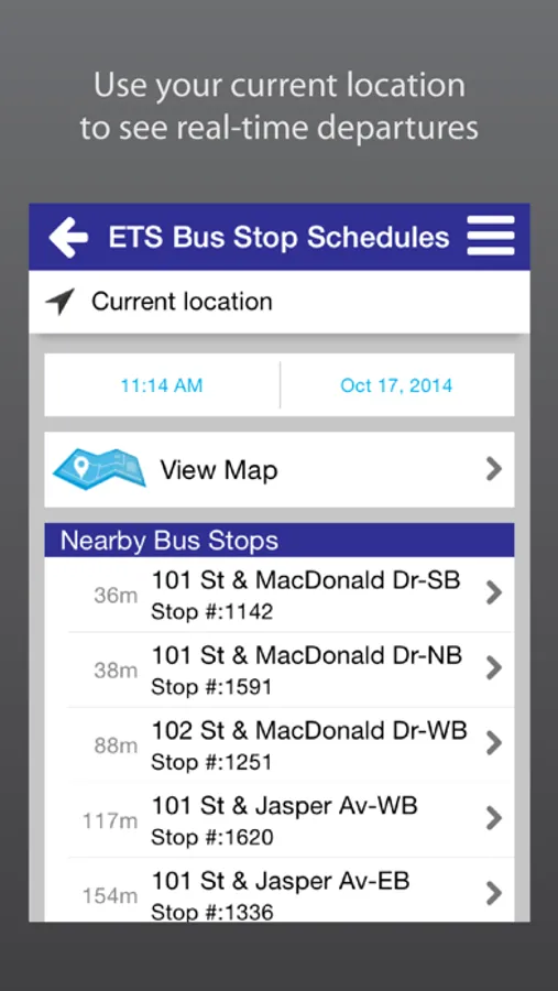 Take control of your time with ETS Live® To Go. Get real-time information for ETS Smart Bus routes anytime, anywhere. Use your current location to see real-time departures instantly, or access your personal contacts straight from the app to find nearby bus stops. Save your favourite bus stop, address or landmark for future convenience. With ETS Live® To Go, your bus is just a touch away!