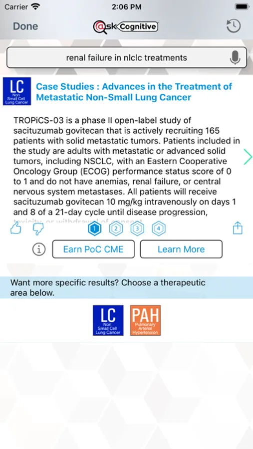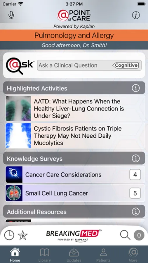 Featuring @sk with Cognitive AI, clinicians use @Point of Care™ Pulmonology to easily access curated, evidence-based, and disease-specific medical content. Clinicians navigate content by asking voice-enabled natural language questions. The @sk with Cognitive AI, confidence-rated answers happen more quickly to efficiently incorporate best treatment options and decisions are made faster to improve patient outcomes at the point of care.