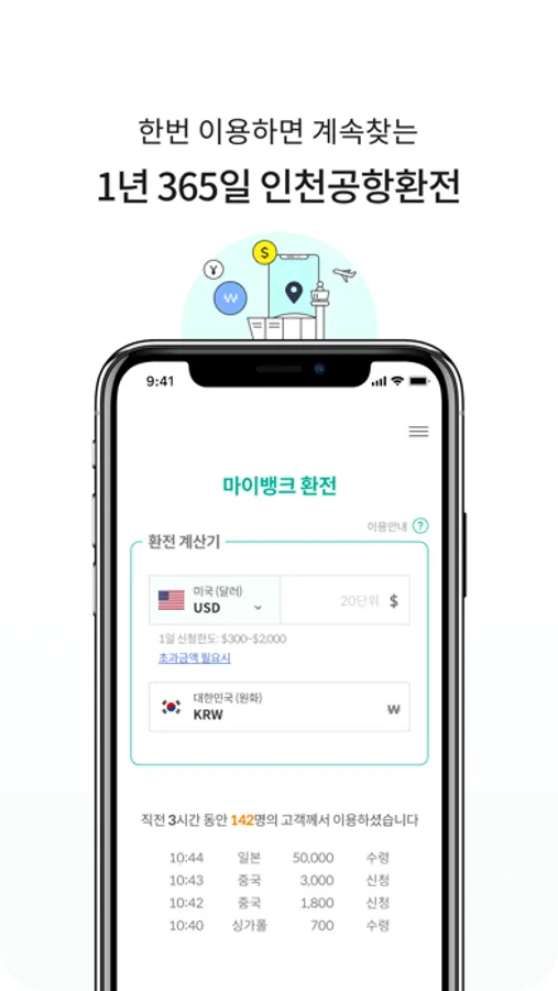 • 환전신청 10분내 인천공항 내위치에서 외화 수령