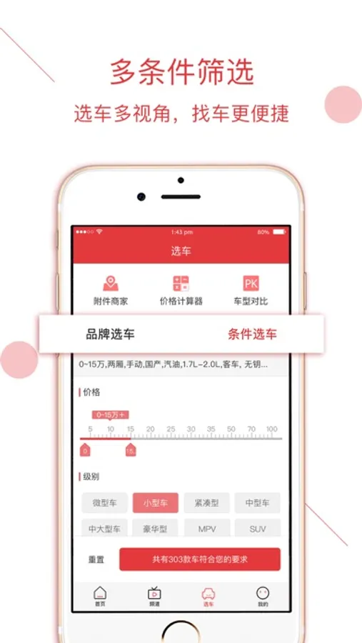 品牌选车、价格选车、类别选车,各种购车条件由你定,合适的车型马上出现。