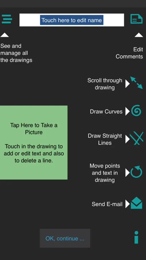 You can draw straight lines, curves, scroll through the drawing, add text to the drawing and move points and text in the drawing.