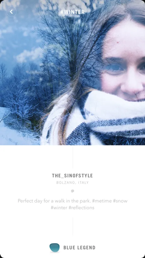In one fluid motion you can create #Reflections by combining your front and back facing camera. Just tap and hold and the app will automatically switch from front to back camera and then blend your images. Or, with the new update, select two of your favorite pictures from your library. The app will blend the images into a unique #Reflection.