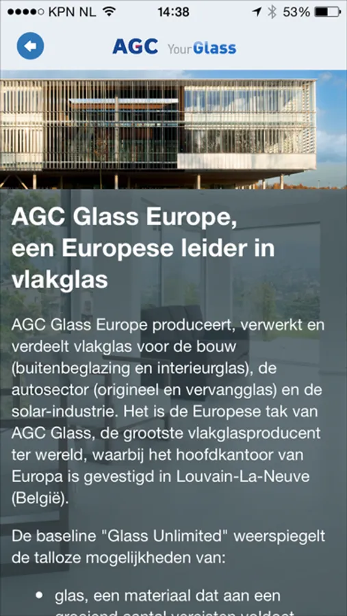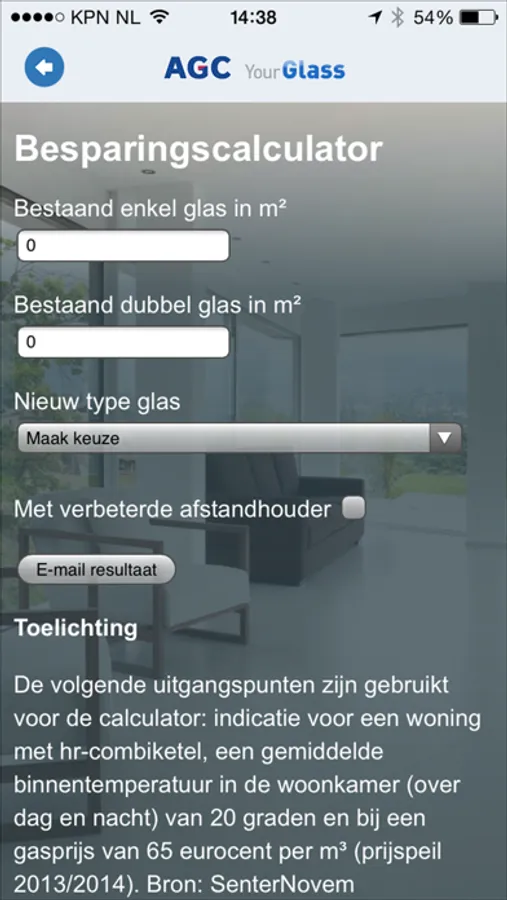 Calculator van AGC Nederland om de energiebesparing te berekenen wanneer men voor een bepaald type glas kiest. AGC Glass Europe produceert, verwerkt en verdeelt vlakglas voor de bouw (buitenbeglazing en interieurglas), de autosector (origineel en vervangglas) en de solar-industrie. Het is de Europese tak van AGC Glass, de grootste vlakglasproducent ter wereld, waarbij het hoofdkantoor van Europa is gevestigd in Louvain-La-Neuve (België).