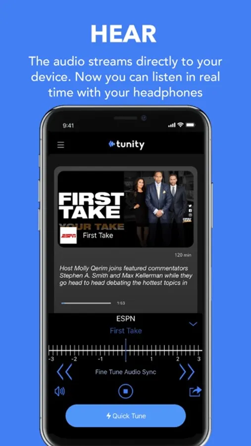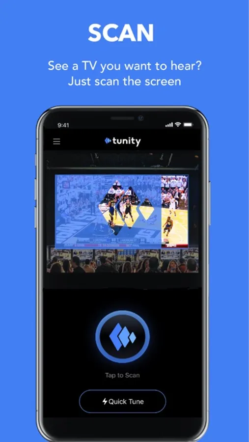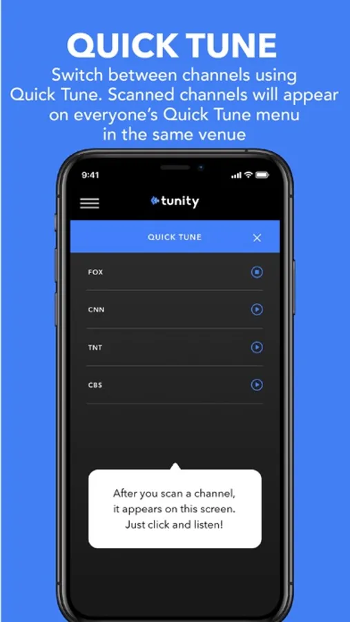 TUNITY allows you to hear any live muted TV. You simply scan the TV with the camera in the app, and let Tunity do its magic: identify the channel and the exact timing of what you’re watching, and streams the synchronized audio to your headphones or bluetooth speaker. With the new Quick Tune feature, channels you (or anyone else in that venue) listened to are automatically saved in Quick Tune, so you can listen to it simply by choosing the channel from the Quick Tune list, without the need to rescan!