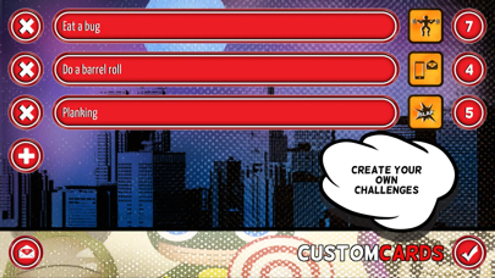 The game has around 50 challenges that include mild violence, mild optional nudity (so choose wisely who you play with), stupidity, public shame, destroying your reputation, "I wish I've never done that" and other fun activities. If you're feeling extra creative you can put up to 500 custom challenges in the game. So "kiss a dog", "do a barrel roll" and other specific challenges will have to be entered manually (don't worry it only takes 10 seconds).