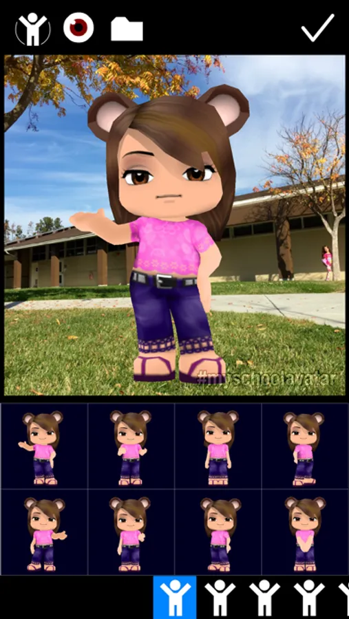 * To pose your avatar: click the icon with the buddy that has arms out stretched (middle left).