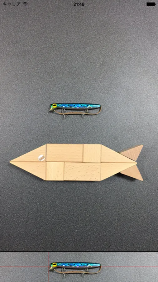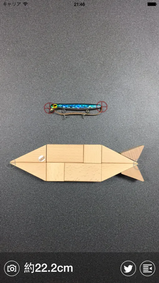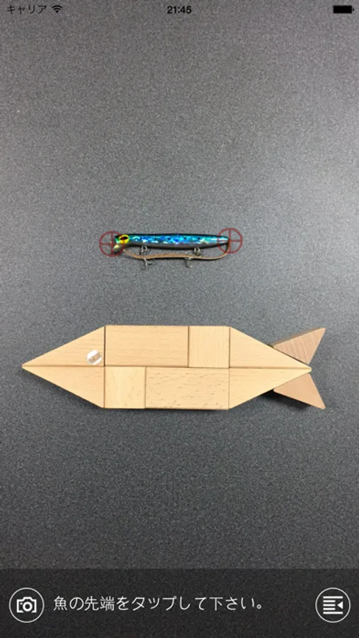 撮影時に、サイズサンプル用のポジションが表示されています。ポジションに合わせて撮影することで、魚の左右のみのタップで計測も可能になります。