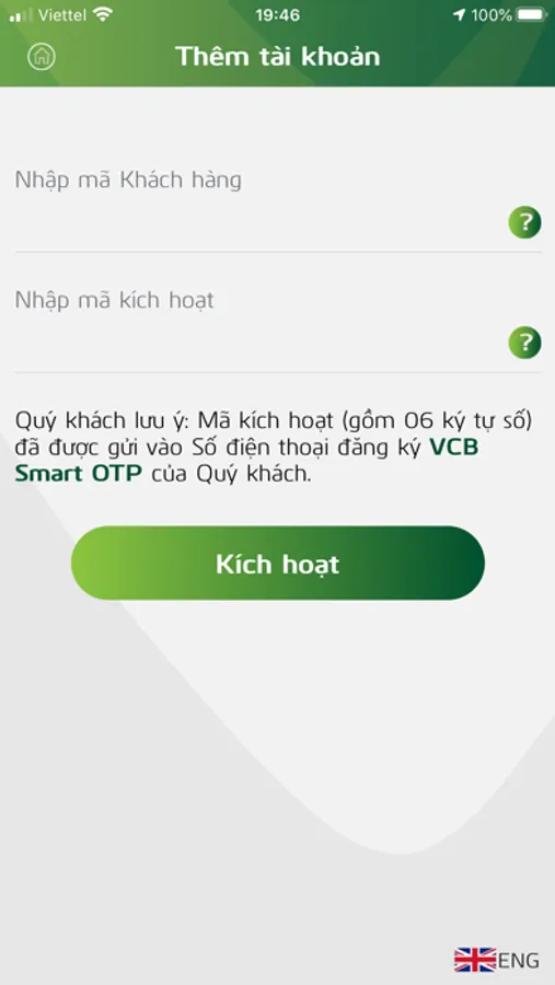Please use your current active credentials registered with Vietcombank services in order to register VCB Smart OTP, i.e. mobile phone number for individuals or username for corporates.