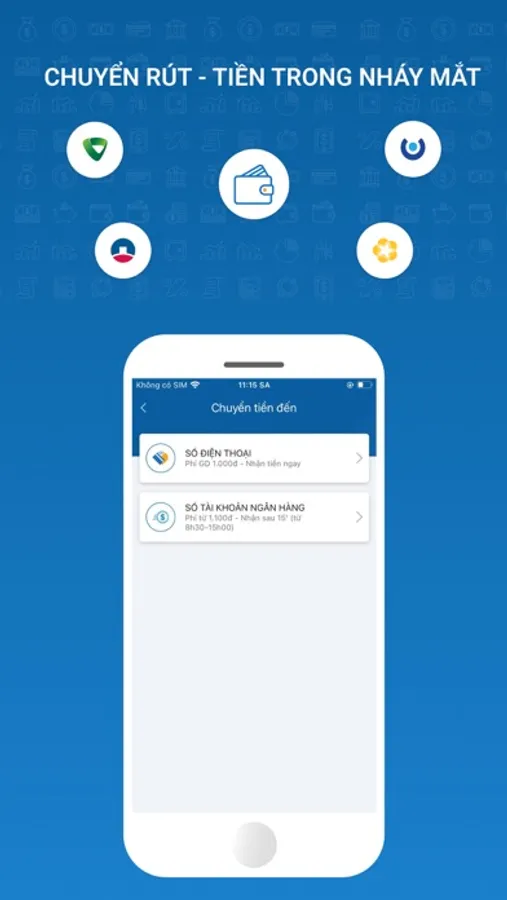 - Chuyển tiền nhanh chóng 24/7: chuyển tiền đến số điện thoại, số thẻ ATM, số thẻ Visa, chuyển đến số tài khoản ngân hàng.