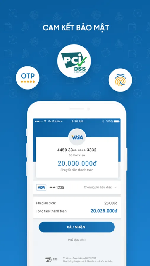 - Vimo cũng đạt được chứng chỉ bảo mật toàn cầu PCI DSS và áp dụng các công nghệ bảo mật vượt trội như: không lưu thông tin thẻ, bảo mật bằng mật khẩu thanh toán, xác thực vân tay,…