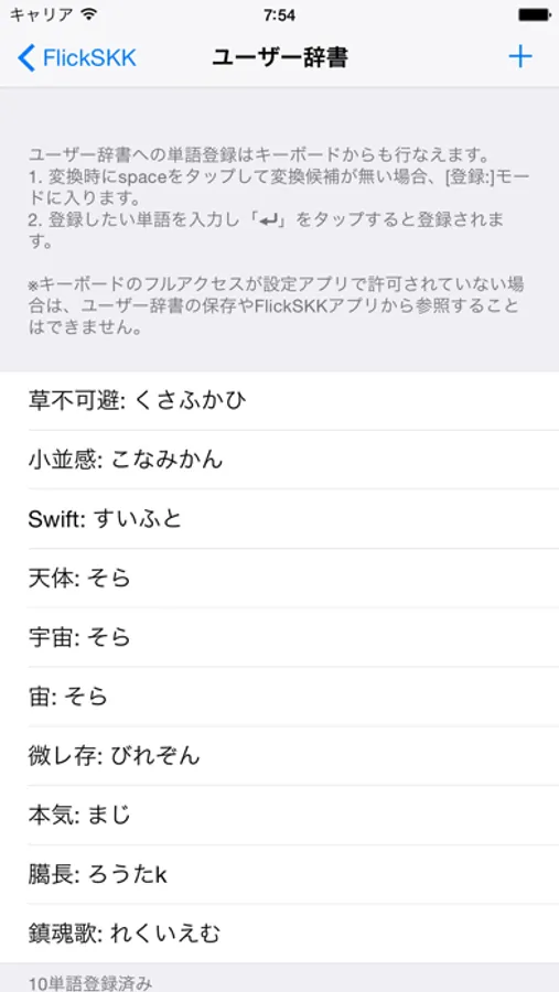 登録した単語は、FlickSKKアプリの「ユーザー辞書」から確認できます。ただし、フルアクセスの許可が必要です。