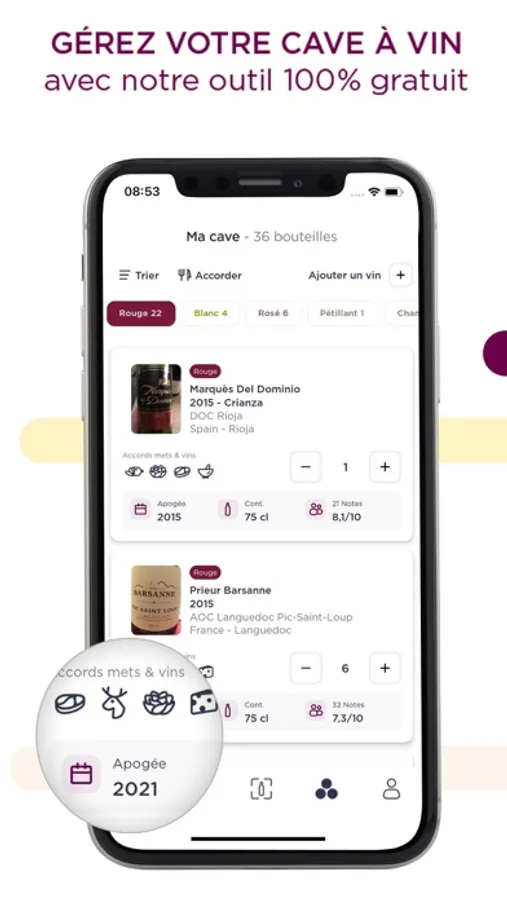 Discover the first FREE cellar management tool that features automatic label recognition! Simply photograph your bottles to create your virtual wine cellar in the app. Then add or remove cuvées from your inventory according to your purchases and tastings. Is mealtime approaching? Easily find the ready-to-drink wine that will match your dish. Managing your inventory has never been so easy and fun!