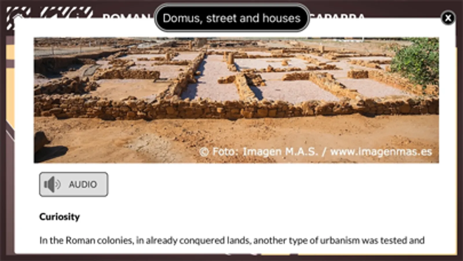 A handy guide and an audio app of the Archeological Roman Site of Cáparra, in Cáceres, in a one device, your own phone!. Entertaining and intuitive, the only way to know each place and each element of this archeological site during your visit. You will also have a memory forever of what you've seen and it costs less than a coffee.