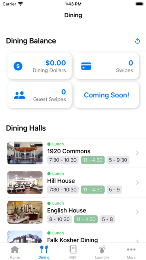 Study room booking, dining hall hours, course schedule, daily menus, laundry machine accessibility, fitness facility hours, and quick access to emergency services!