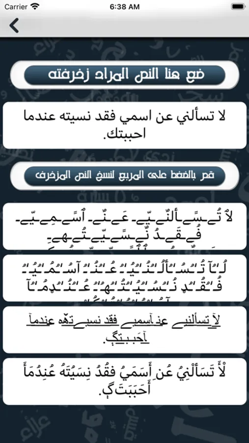 زخرفة النصوص بكل سهوله والزخرفة فورية وامكانية نسخ النص المزخرف بسهولة .