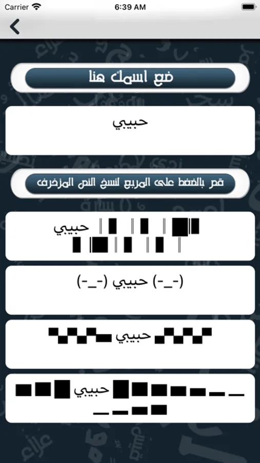 طريقة الاستخدام : قم بادخال النص بالمربع الاول وسوف يتم زخرفته بالمربعات بالاسفل باشكال جميلة ومختلفة , فقط اضغط على النص الذي تود نسخه وسوف ينسخ .