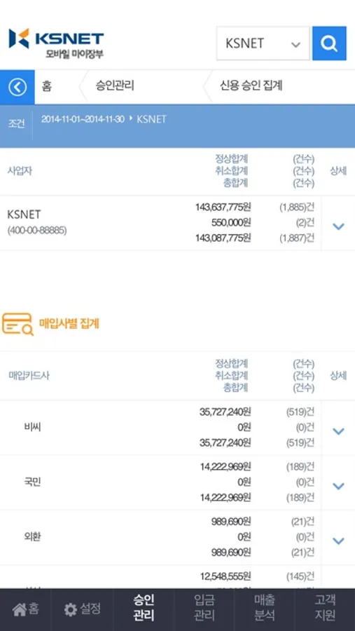 - 상세 메뉴 : 승인캘린더, 신용승인집계, 신용승인상세내역, 현금승인집계,