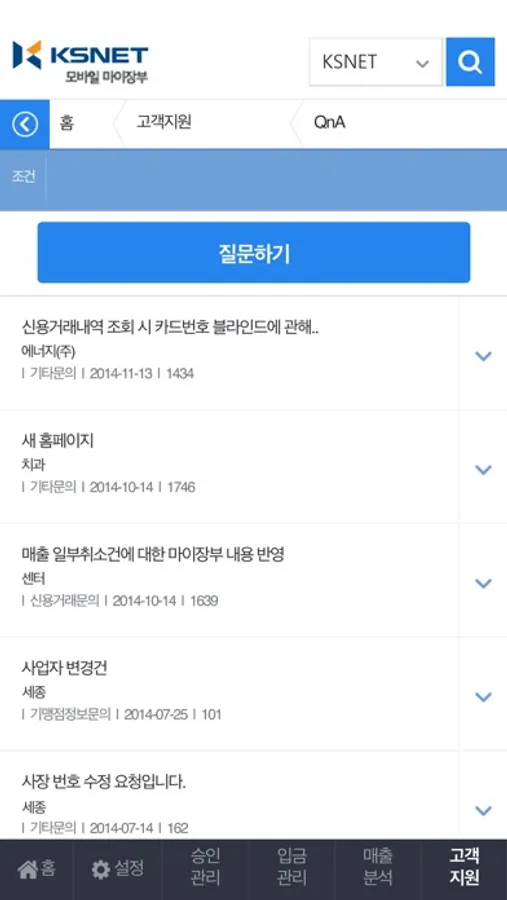 - 상세 메뉴 : 회원정보관리, 가맹점정보관리, 공지사항, Q&A