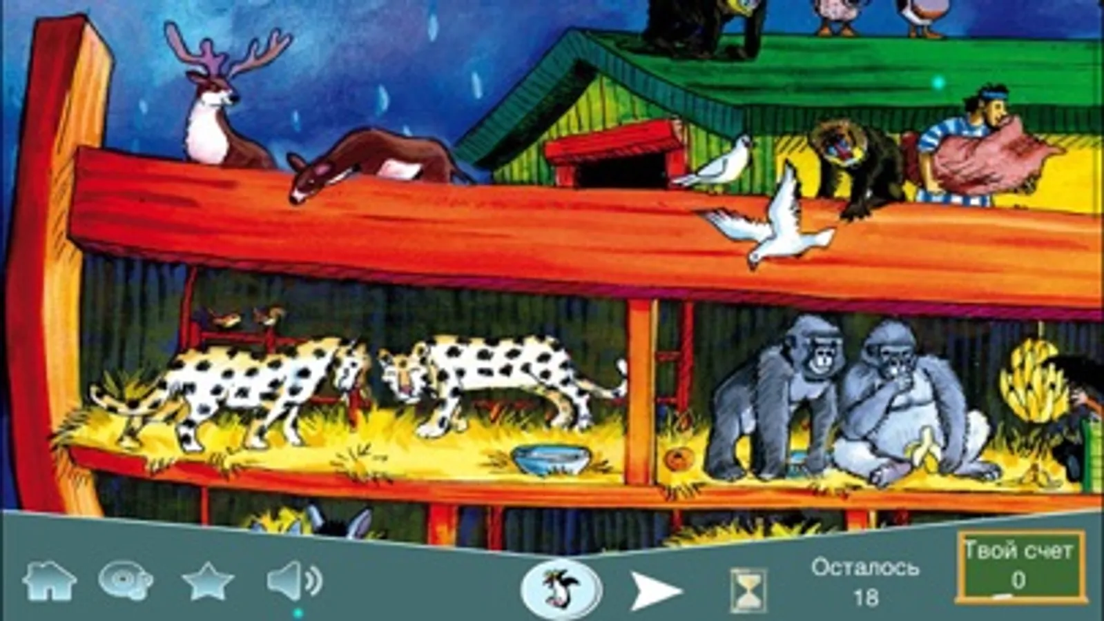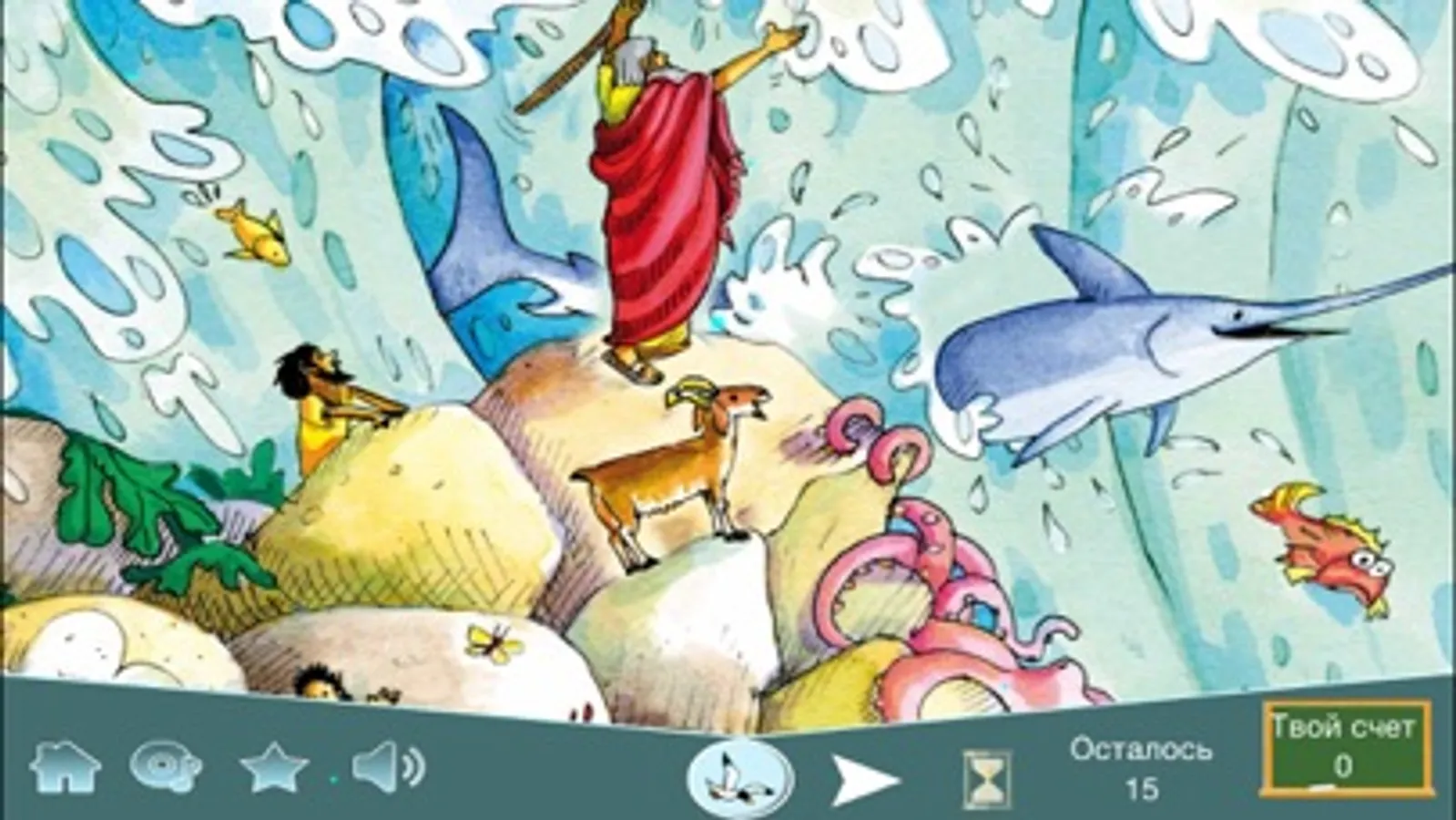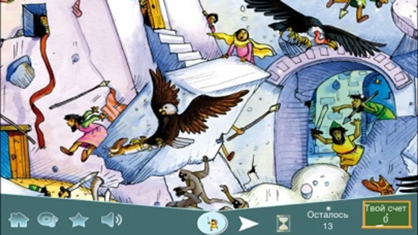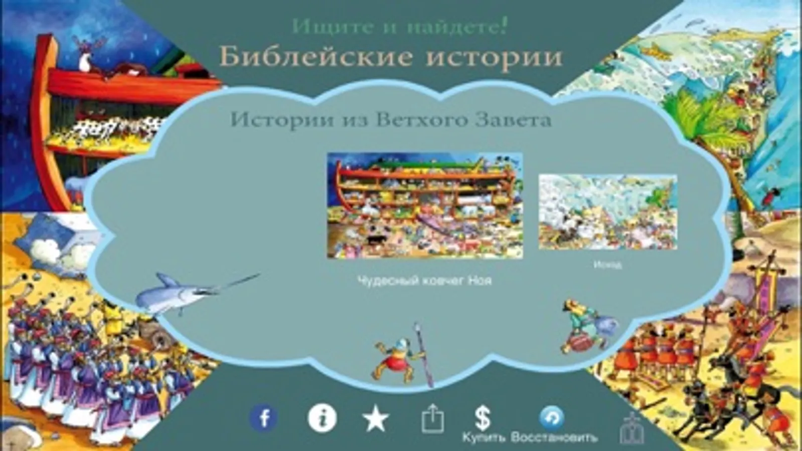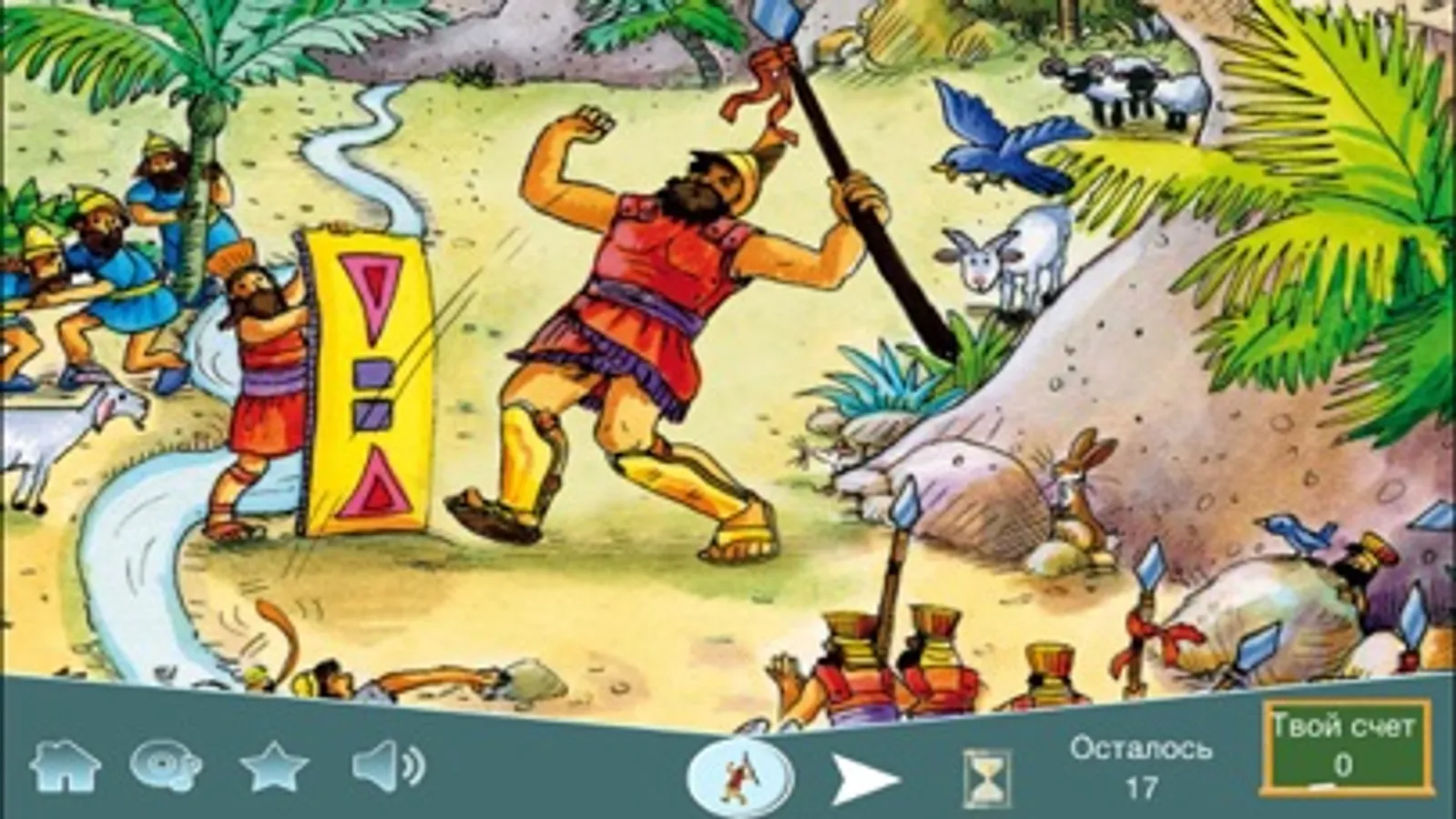 Эта игра — отличный способ познакомить детей с самыми увлекательными историями из Библии и одновременно развить у ребенка внимательность. Каждая история представлена большой и яркой картинкой, на которой ребенку нужно найти людей, животных и предметы из иллюстрированного списка. А если ребенок устанет от поисков, он может послушать аудизапись истории каждой из пяти историй: