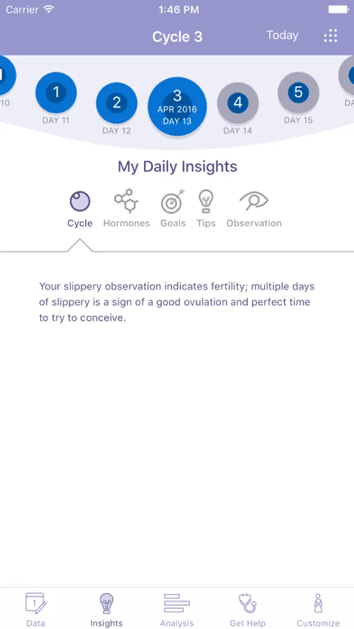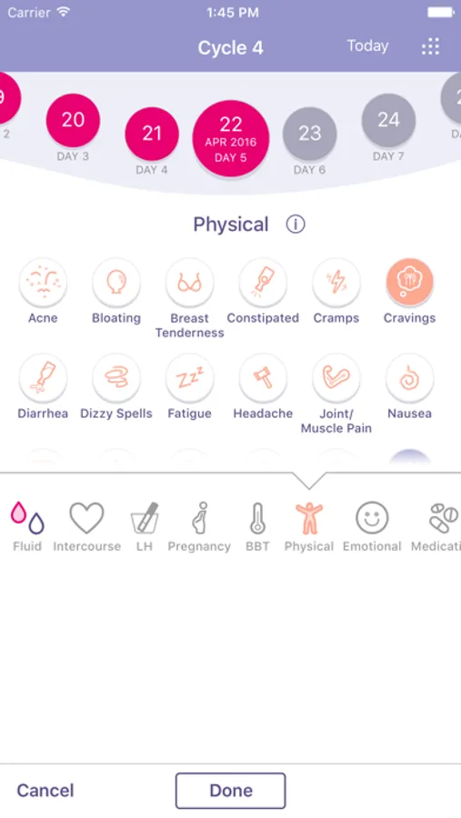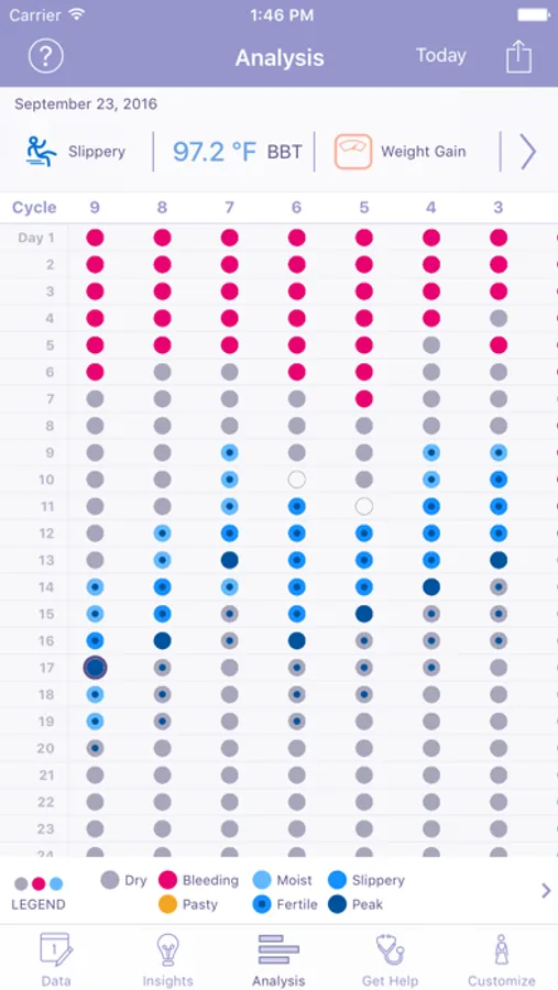 * Various view styles let you see and interpret your cycles better: calendar view, chart view and the detailed chart view, which let you see your symptoms.