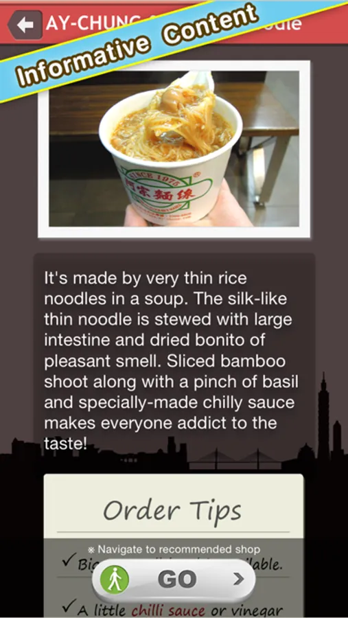 Informative content gives you a better idea on Taiwan's delicious food and convenient navigation function helps you find food stands easily.
