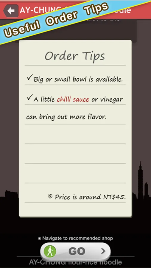 Also it provides useful order tips, so even a foreigner can order street food with no problem.