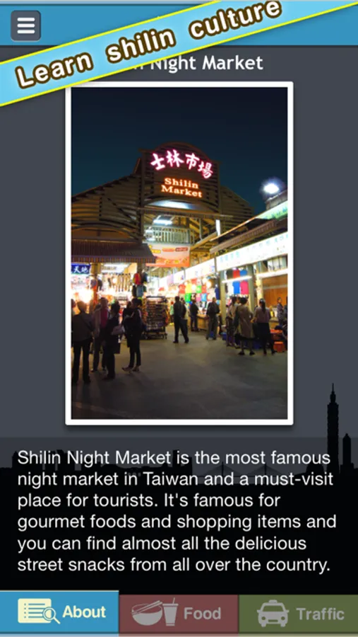 It tells you all kinds of information about Shilin Night Market, including history, food, traffic, location of shops.