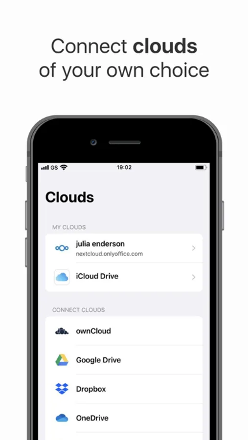 • Connect Nextcloud, ownCloud, Google Drive, iCloud, Dropbox and any other cloud working via WebDAV and edit documents directly from the app.