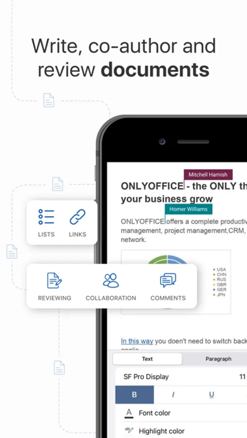 • Edit documents together with your team in real time using ONLYOFFICE cloud.