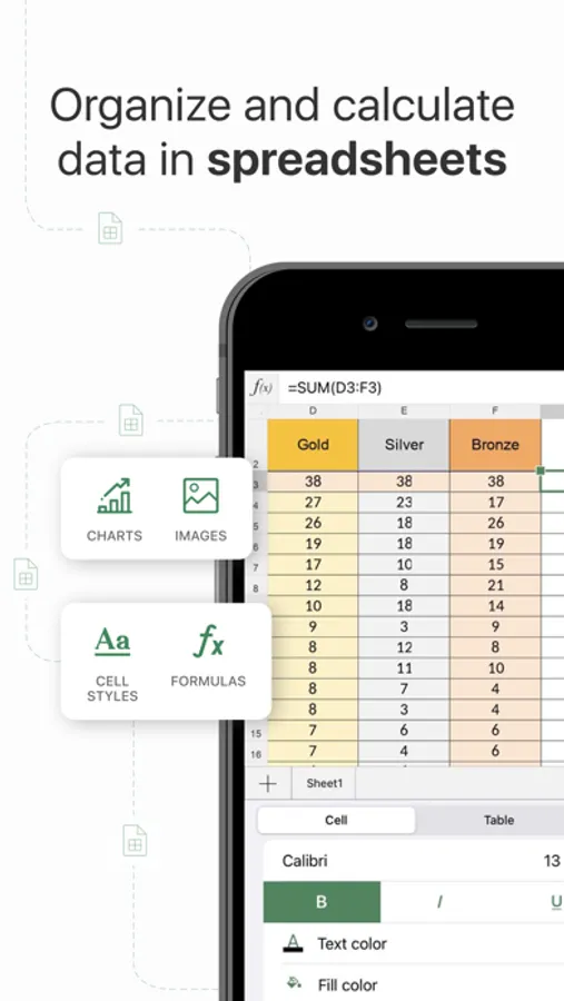 • Use plenty of features for managing your spreadsheet data: work with rows and columns, cell parameters adjustment, more than 450 formulas, sorting and filtering capabilities.