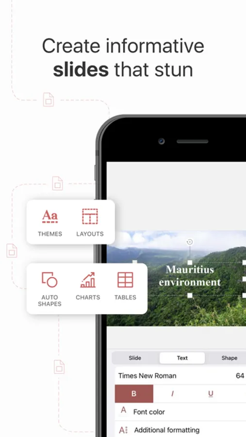 • Work with all popular objects on your slides: add and edit autoshapes, charts and graphs, texts, images and other items.