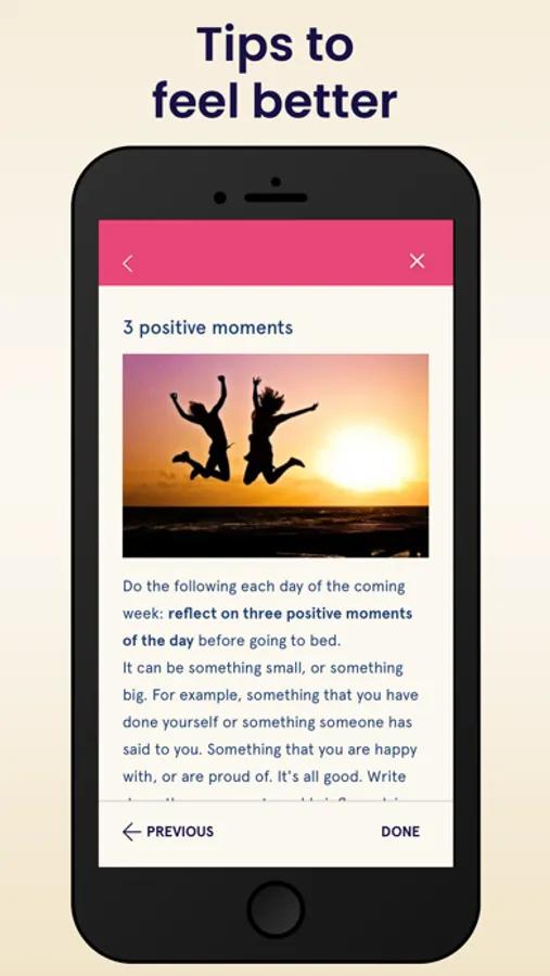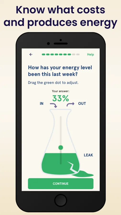 Daily program to build more energy step-by-step. The program consists of positive tips, stress-reduction exercises, physical activities, and education.