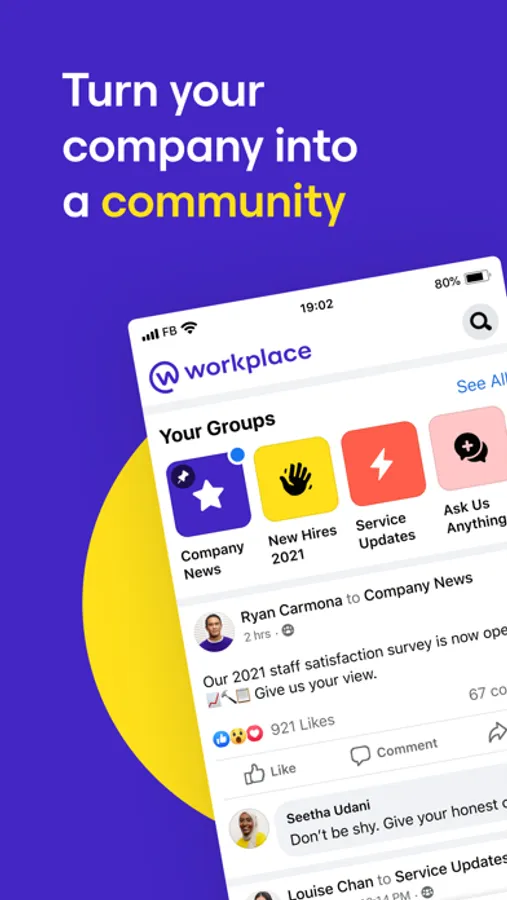Workplace is ad-free and totally separate from Facebook. So you and your team can concentrate on aligning your goals, building successful working relationships and turning your company into a community.
