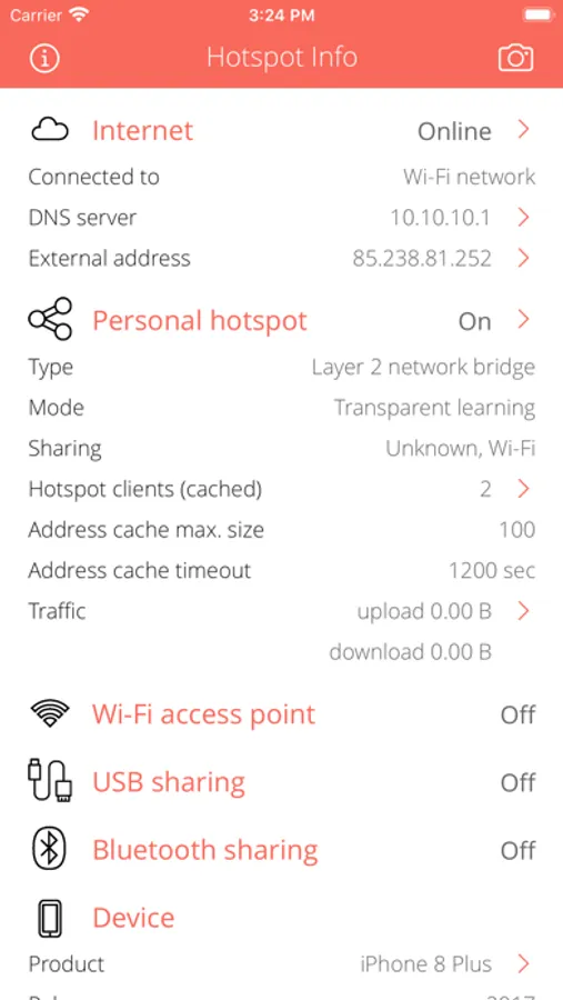 Everything you want to know about your PERSONAL HOTSPOT but were afraid to ask. Hotspot Info is a small and useful utility that lets you see detailed information about current Personal Hotspot sharing from sharing types to connected clients and more.