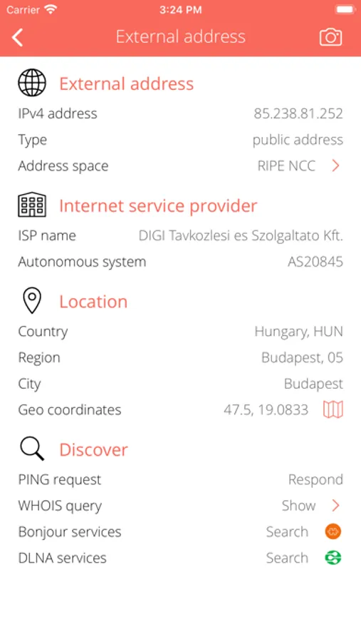 • Depth external address analysis: ISP name, autonomous system name, whois, ping, regional internet registry info.