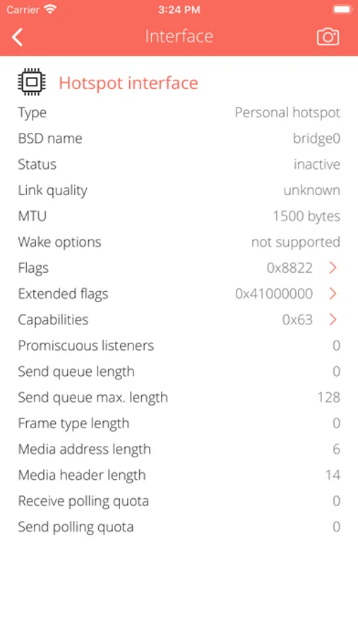 • Low-level informations about the personal hotspot (bridge), W-Fi access point, Bluetooth and USB interface, technical parameters, flags.