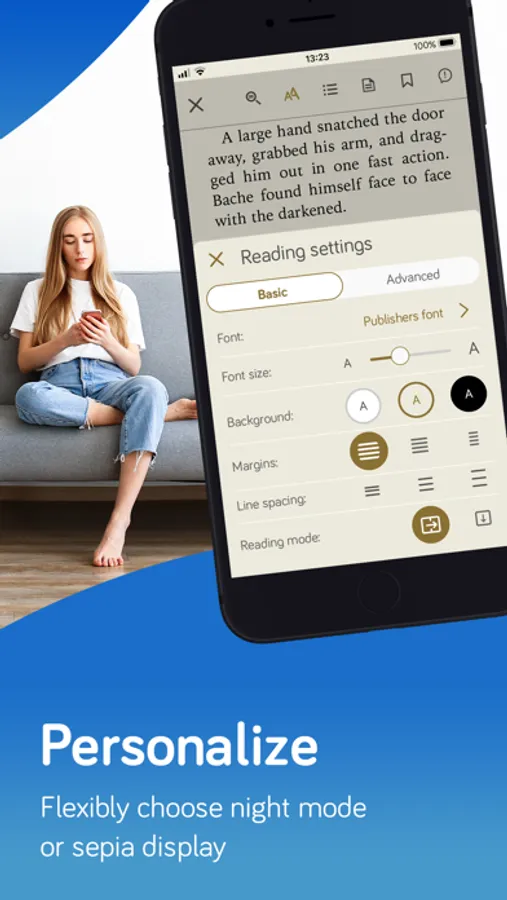 - Change the background colour of the eBook while reading, e.g. to night mode or sepia display