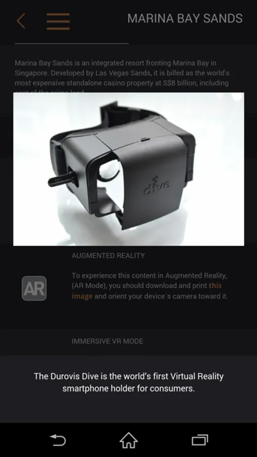 The Augmented Reality application uses your device’s camera to display interactive 3D models with motion tracking. To experience this content in Augmented Reality, (AR Mode), download and print the Tracker Image Marker and orient your device's camera toward it. The Tracker Image Marker works best when flat on a table. You can download marker here: http://goo.gl/oLgJGj