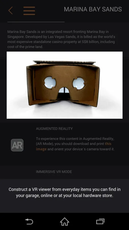 Get the free app and become instantly immersed in a growing selection of AR and VR experiences on your mobile device. Currently, you can experience your application in three different modes: Normal, AR, and VR.